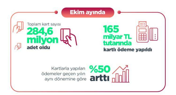 Tablo 1: Kart Sayıları (Milyon Adet) Gelişimi Kart Sayıları (Milyon Adet) 2020 Ekim 2021 Ekim Değişim Kredi Kartı 74,8 82,8 %11 Banka Kartı 142,3 147,5 %4 Ön Ödemeli Kart 41,1 54,4 %32 Toplam 258,2 284,6 %10Ekim ayında 165 milyar TL tutarında kartlı ödeme yapıldıEkim ayında kredi kartları, banka kartları ve ön ödemeli kartlar ile yapılan toplam ödeme tutarı bir önceki yılın aynı dönemine göre yüzde 50 artarak 165 milyar TL oldu. Ekim ayındaki kartlı ödeme tutarının 133,7 milyar TL'si kredi kartları ile yapılırken, 28,2 milyar TL'sinde banka kartları, 3,1 milyar TL'sinde ise ön ödemeli kartlar kullanıldı. Kredi kartı ile ödemelerde önceki yılın aynı dönemine göre büyüme oranı yüzde 47, banka kartı ile ödemelerde yüzde 54 olurken, ön ödemeli kartlar ile yapılan ödemelerde ise bu oran yüzde 238 olarak gerçekleşti.