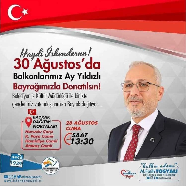 “Haydi, İskenderun30 Ağustos’ta evlerimiz ve işyerlerimiz şanlı Ay Yıldızlı Bayraklarımızla Donatılsın. Bu çerçevede Belediyemiz Kültür Müdürlüğü ile birlikte gençlerimiz vatandaşlarımıza 28 Ağustos Cuma günü saat 13.30’da bayrak dağıtacak.