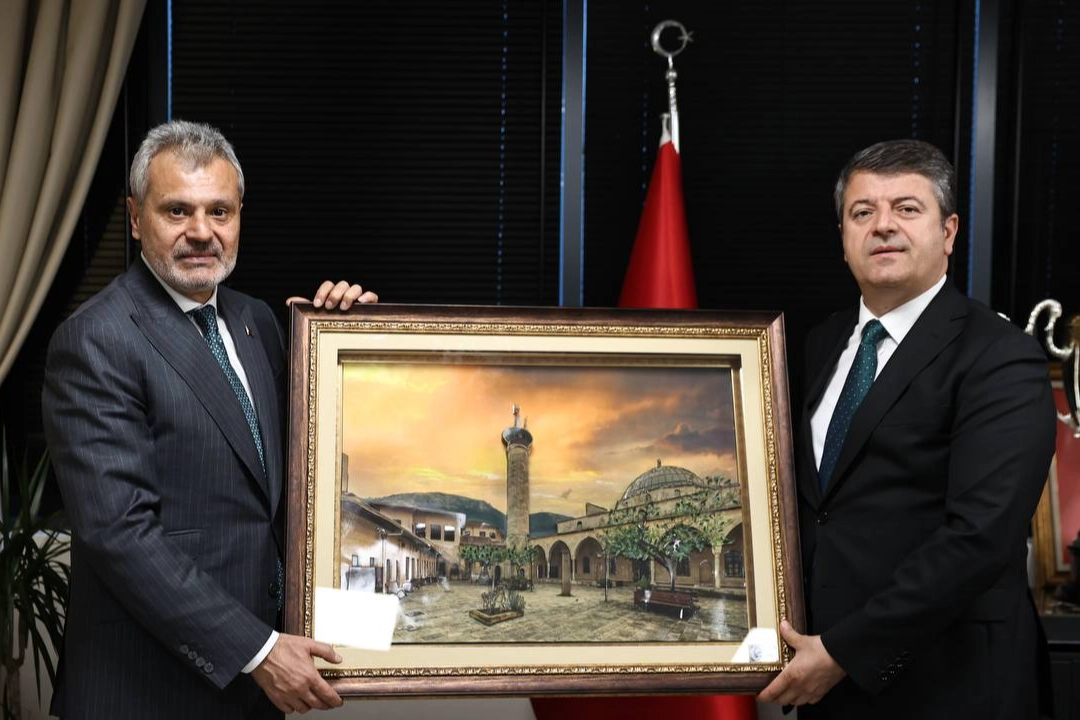 Başkan Öntürk, Başkan Tutdere’ye Habibineccar Camisi tablosu hediye etti ve ziyaretinden dolayı teşekkür etti.