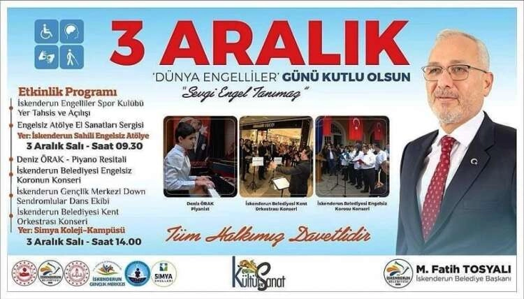 Belediye olarak engelli vatandaşların her zaman yanlarında olduklarını belirten Başkan Fatih Tosyalı,"Bu önemli günde belediye olarak çeşitli etkiler organize edildi. 3 Aralıkta ilk olarak İskenderun Sahil Engelsiz Atölye'de Saat: 09:30'da Engelsiz Atölye El Sanatları Sergisi ve İskenderun Engelliler spor kulübüne yer tahsisi ve açılışı yapılacak. Ardından Simya Koleji Kampüsünde saat 14:00'da Deniz Örak Piyano Resitali, İskenderun Engelsiz Koro Konseri, İskenderun Gençlik Merkezi ve Down Sendromlular Konseri, İskenderun Belediyesi Kent Orkestrası Konseri düzenlenecek" dedi.