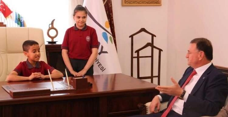 Temsili olarak Belediye Başkanlığı makamına oturan Samet Sertkaya, bu makamda oturmanın heyecan verici olduğunu söyledi. HBB daire başkanları, okul öğretmenleri ve öğrencilerinin de eşlik ettiği törende temsili başkan kent düzeninin iyileştirilmesi için talimatlar verdi. Başkan Savaş, makamını devrettiği çocuklara, Ulu Önder Mustafa Kemal Atatürk’ün açtığı yoldan ayrılmayarak çok çalışmaları ve ülkeye uluslararası başarılar getirmeleri temennisinde bulundu. Başkan Savaş, çocuklara ve onları eğiterek topluma yararlı bireyler haline getiren öğretmenlere hediyeler verdi. Toplu anı fotoğrafı çekiminin ardından tören sona erdi.