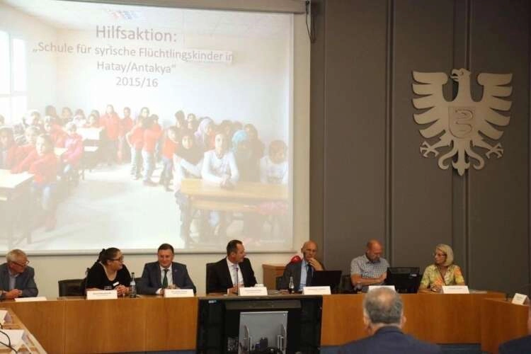 HBB Başkanı Doç. Dr. Lütfü Savaş, Reyhanlı'da Suriyeli misafirlerimiz için yaptırılan okulla ilgili kardeş şehir Aalen'in yöneticileriyle toplantıya katıldı. Eğitime verdiği önem ve bu alanda gerçekleştirdiği atılımlarla örnek bir sosyal belediyecilik anlayışıyla hareket eden Başkan Savaş, Almanya Aalen Belediye Başkanı ve yöneticilerden 24 derslikli yapılan okul hakkında bilgiler aldı.