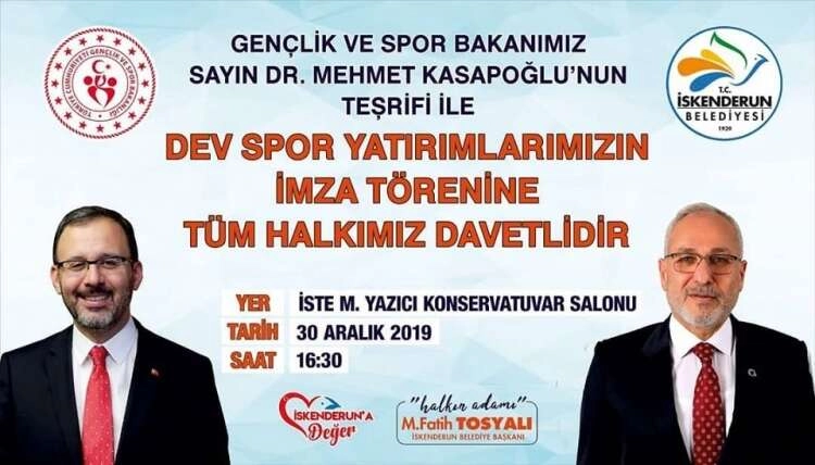 Bu çerçevede Gençlik ve Spor Bakanımız Sn. Dr. Mehmet Muharrem Kasapoğlu'nun teşrifi ile 30 Aralık 2019 Pazartesi saat:16.30’da İskenderun Teknik Üniversitesi (İSTE) Mustafa Yazıcı Konservatuar Salonunda düzenlenecek olan "Dev Spor Yatırımlarımızın İmza Törenine" tüm halkımızı davet ediyoruz. İskenderun’a değer"