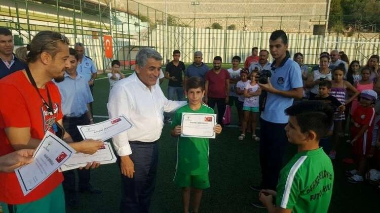 Defne Belediyesi Yaz Futbol Okulu kapsamında 120 öğrenci katılım sertifikalarını Defne Belediye Başkanı Dr. İbrahim Yaman’ın elinden aldı. Yaz sezonunu boyunca, Defne Belediyesince modernize edilip sentetik çim ile kaplanan Dursunlu Futbol Sahasında, Yaz Futbol Okuluna ücretsiz olarak 140 öğrencinin katıldığını ifade eden Başkan Yaman “Defne Belediyesi Yaz Futbol Okullarımıza katılan ve bugün sertifikalarını alan yavrularımızı tebrik ediyorum” dedi.