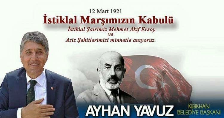 Kırıkhan Belediye Başkanı Ayhan YAVUZ, İstiklal Marşımızın kabulünün 101. yılı münasebetiyle kutlama mesajı yayınladı. Başkan Yavuz mesajında şunları söyledi;