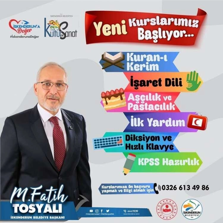 Haftanın belirli günlerinde katılım göstererek el emeği göz nuru çok sayıda çalışmayı ortaya koyan kursiyerlerin verilen eğitimlerden son derece memnun olduklarını belirten Başkan Fatih Tosyalı,” Yeni İşaret Dili - Denizciler Kültür Merkezi, İlk Yardım - Denizciler Kültür Merkezi, Aşçılık ve Pastacılık Kursu - Tayfur Sökmen Bulvarı Kültür Merkezi, Diksiyon ve Hızlı Klavye Mustafa Kemal Mah. kültür Evi, KPSS Hazırlık Kursu Mustafa Kemal Mah. Kültür Evi, Kuran-ı Kerim Kursu Denizciler Kültür evinde başlayacaktır ”şeklinde konuştu.