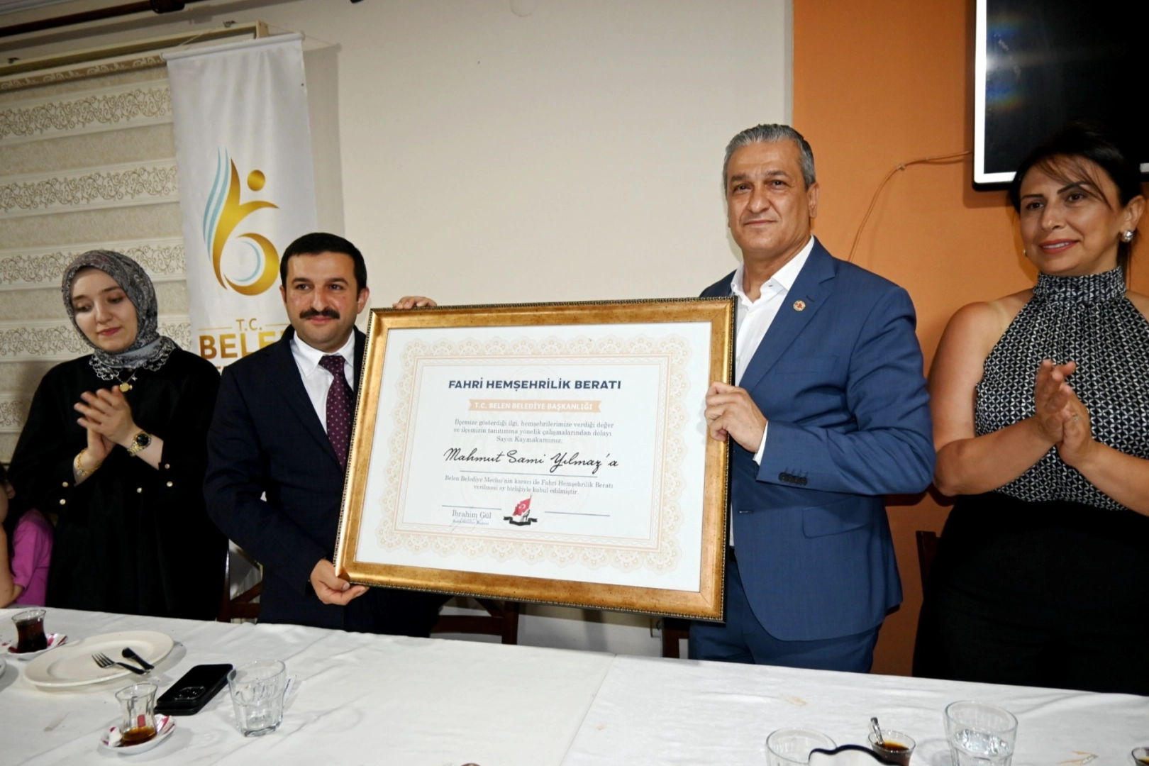 Programda, görev süresi boyunca sergilediği duruş ve özellikle 6 Şubat depremleri sonrası gösterdiği özverili çalışmalarla gönüllerde iz bırakan Kaymakam Mahmut Sami Yılmaz’a duyulan sevgi ve takdir bir kez daha güçlü şekilde ifade edildi. Gecenin sonunda Başkan İbrahim Gül tarafından, Belen halkı adına kendisine “Fahri Hemşehrilik Beratı” takdim edildi.