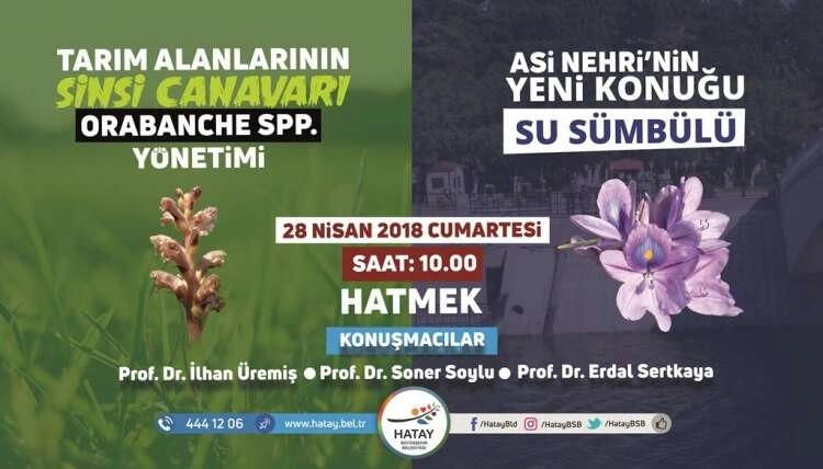 Tarım alanlarının sinsi canavarı ve dünyanın en tehlikeli parazit bitkisi olan Orabanche ile Asi Nehri’nin yeni konuğu ‘su sümbülü’ konulu bilgilendirme konferansı düzenleniyor. Prof. Dr. İlhan Üremiş, Prof. Dr. Soner Soylu ve Prof. Dr. Erdal Sertkaya’nın bilgiler paylaşacağı konferans, 28 Nisan 2018 Cumartesi günü saat:10.00’da HATMEK konferans salonunda gerçekleşecek.