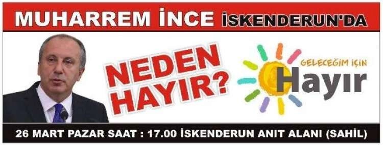 Referandum çalışmaları kapsamında yurt genelinde başlattığı ‘Hayır’ mitinglerinden birini İskenderun’da yapmayı planlayan İnce 26 Mart 2017 Pazar günü saat 17.00’de Atatürk Anıt Alanı’nda halka hitab edecek. CHP İlçe Teşkilatı’ndan yapılan açıklamada mitinge tüm halkımızın davetli olduğu bildirildi.