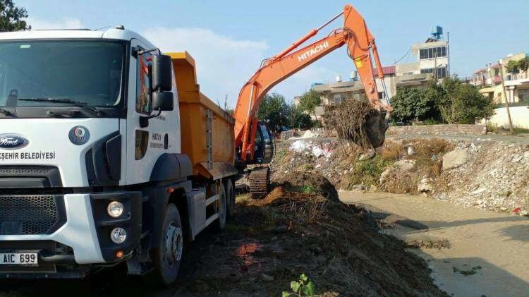 Ekipler, Defne’nin Koçören ve Çınarlı ile Samandağ’ın Kuşalanı mahallelerindeki dere ve kanalları iş makineleri yardımıyla temizledi.