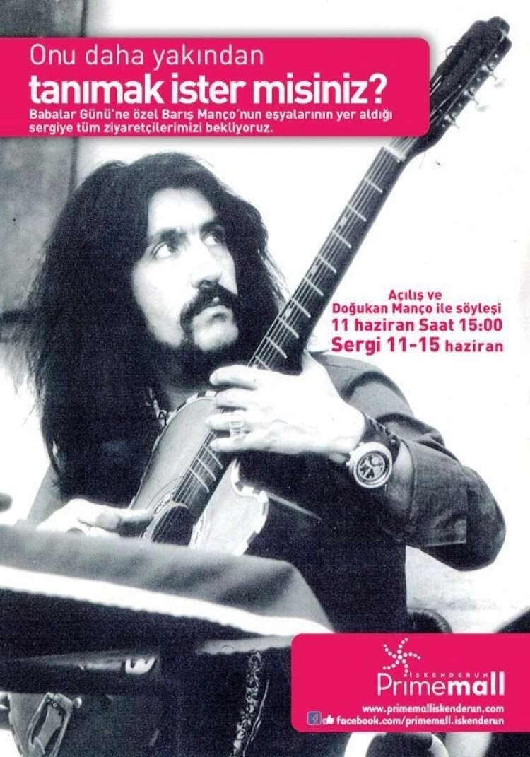 Bugüne kadar sayısız sergiye imza atan Prime Mall İskenderun Alışveriş Merkezi, bu kez ziyaretçilerini efsane sanatçımız Barış Manço’ yu yakından tanıtacak bir sergide buluşturacak. Bir dönem müzik dünyasına adını altın harflerle yazdıran efsane sanatçı Barış Manço’nun sevenleri bu sergide buluşacak. Büyük ilgi görmesi beklenen Barış Manço Sergisi 11-15 Haziran 2014 tarihleri arasında Prime Mall İskenderun’da açık kalacak. Açılışını oğlu Doğukan Manço’nun yapacağı ‘’Barış Manço Sergisi’’ nde Efsane Sanatçı Barış Manço’nun sahne kıyafetleri, özel eşyaları, takıları ve daha birçok hatırası sergilenecek. Bu unutulmaz sergiyi ziyaret etmek ve Barış Manço’yu daha yakından tanımak isteyen herkesi 11-15 Haziran tarihleri arasında Prime Mall İskenderun Alışveriş Merkezi’ne davet ediyoruz.