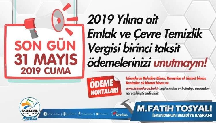 Konuyla ilgili İskenderun Belediyesi’nden yapılan açıklamada Emlak ve ÇTV vergilerinin ödemelerinin en son 31 Mayıs’a kadar yapılabileceği belirtildi.