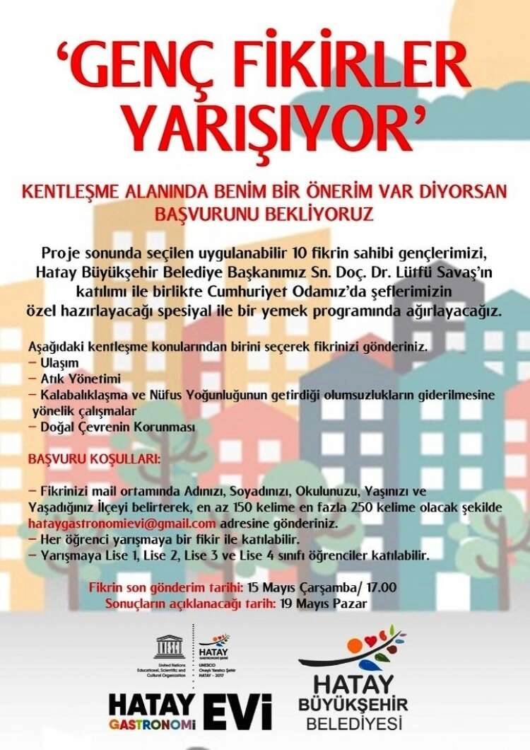 Her öğrencinin yalnızca bir fikir ile katılabileceği yarışmaya başvurmak isteyen gençler, mail ortamında adını, soyadını, okulunu, yaşını ve yaşadığı ilçeyi belirterek en az 150 kelime en fazla 250 kelime olacak şekilde hataygastronomievi@gmail.com adresine gönderebilecek.