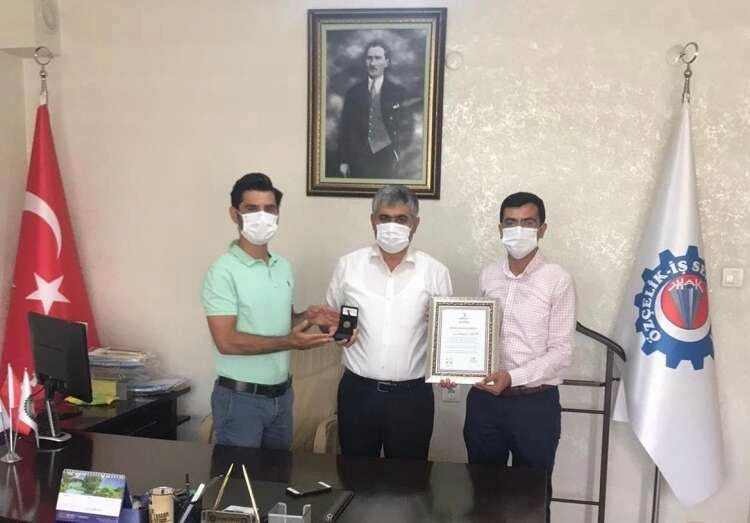 Güngör’e madalya ve plaketi sendikanın şube binasında Kızılay İskenderun Şubesi Doktoru Sinan Atmaca tarafından takdim edildi.
