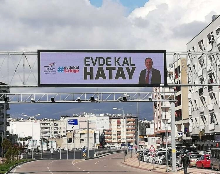 Halk sağlığını gözeten çalışmalarına il genelinde devam eden HBB, Hatay halkının evde kalması amacıyla Antakya ve İskenderun ilçelerine 'Evde Kal' ve Hatay Büyükşehir Belediyesi Halk Sağlığını Ön Planda Tutuyor' yazılı led ekranlar yerleştirdi.
