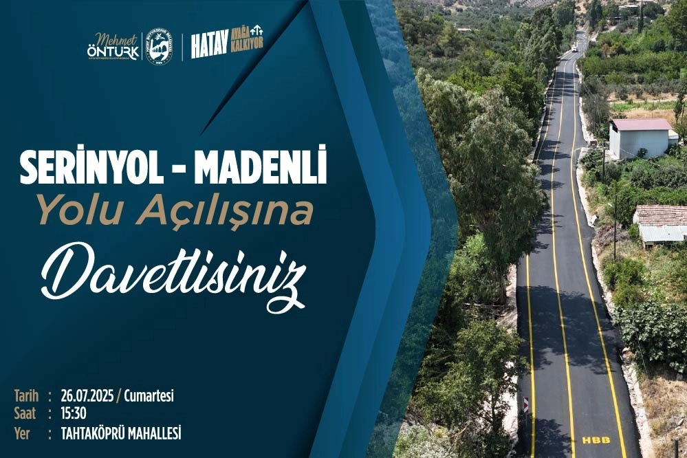 Antakya Serinyol-Arsuz Madenli yolu, 26 Temmuz 2025 Cumartesi günü saat 15.30'da Antakya Tahtaköprü Mahallesi’nde düzenlenecek törenle hizmete açılıyor.