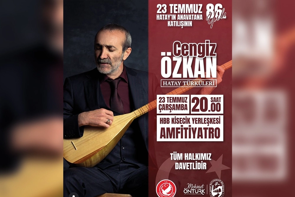 Hatay’ın Ana Vatana Katılışı’nın 86. yıl dönümü nedeniyle Hatay Valiliği ve HBB tarafından düzenlenecek etkinlikler kapsamında ücretsiz konserde ünlü müzisyen ve bağlama sanatçısı Cengiz Özkan, birbirinden güzel türkülerle Hataylı müzikseverlerle buluşacak.