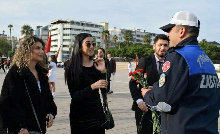 30 zabıta personelinin katıldığı ziyaretlerde öğretmenleri yalnız bırakmayan ekipler, günün anısına öğretmenlere karanfil hediye etti.