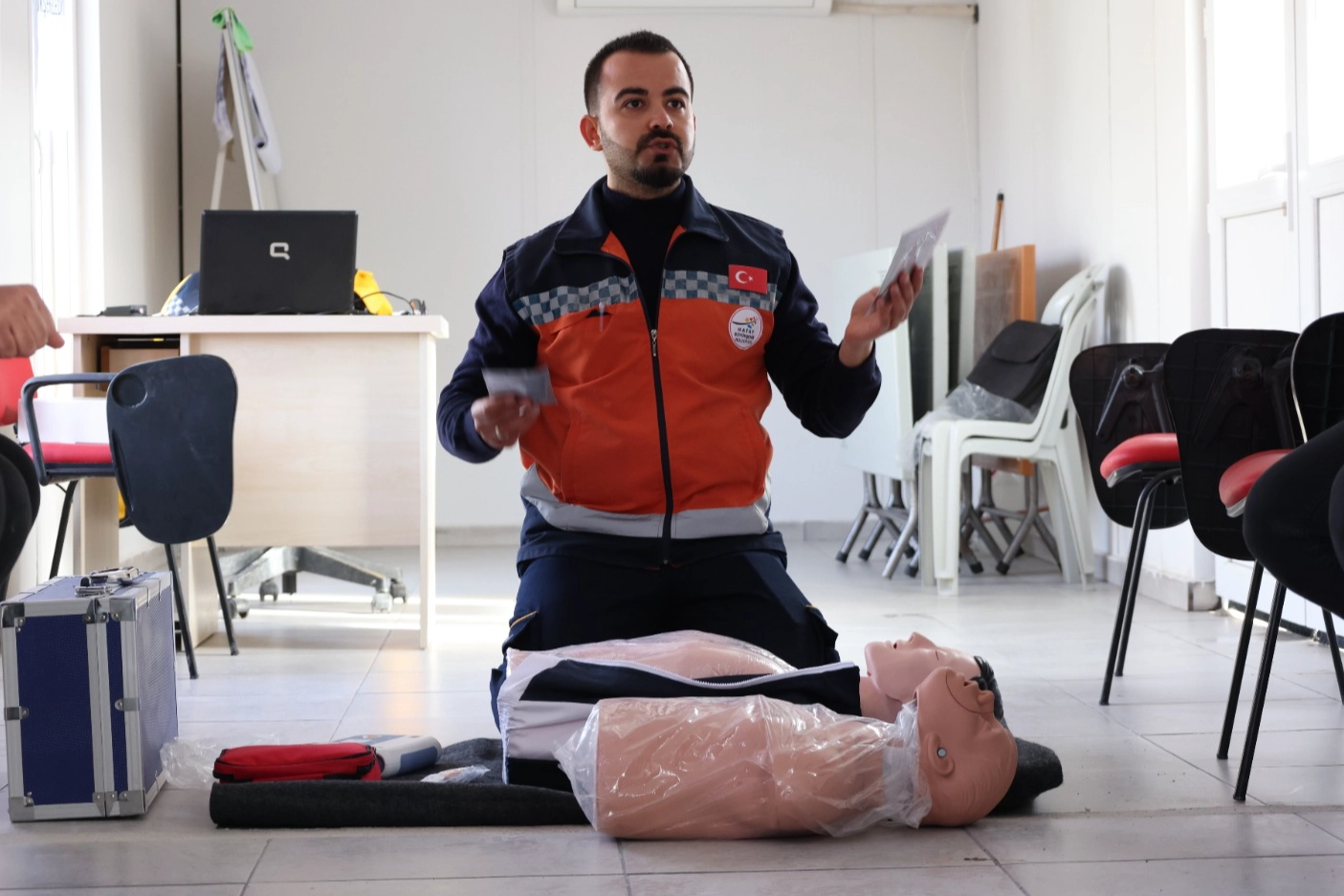 Antakya Kiptaş Geçici Yaşam Alanında HBB Sağlık ve Sosyal Hizmetler Daire Başkanlığı tarafından açılan İlkyardım Eğitim Merkezi vatandaşlara ücretsiz ilk yardım eğitimi vermeye başladı.