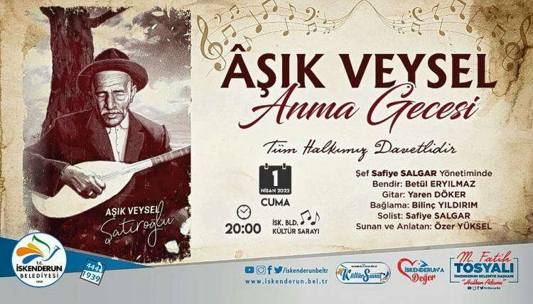 İskenderun Belediyesi, Halk Ozanı Aşık Veysel Şatıroğlu'nun vefatının 49'uncu yıldönümü nedeniyle anma programı düzenleyecek.
