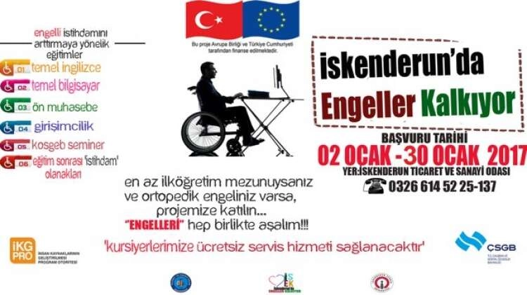 Dezavantajlı Kişilerin Sosyal Entegrasyonu ile İstihdam Edilebilirliklerinin Desteklenmesi Hibe Programı Kapsamında, İskenderun Ticaret ve Sanayi Odası’nın yürütücülüğünü üstlendiği, İskenderun Teknik Üniversitesi’nin ortak olduğu, ‘İskenderun’da Engeller Kalkıyor’ Projesi kurslarına katılım için başvurular başladı. Yapılan açıklamada; 12 ay boyunca uygulanacak olan proje kapsamında, 100 engelli vatandaşımıza, Girişimcilik, Temel Muhasebe, İngilizce, Bilgisayar kursları verilecektir. Ayrıca İskenderun’da Engeller Kalkıyor Projesi kapsamında İskenderun’daki engelli bireylerin yaşam standartlarını arttırmaya yönelik yenilikçi faaliyetler ortaya koyma, Engelli vatandaşların iş gücü piyasasında yer almasını sağlayacak eğitimler verme Kamu ve özel sektörde engelli bireylerin istihdamına yönelik bilinç oluşturma Eğitime katılan kursiyerlerin KOSGEB tarafından bilgilendirilmesinin sağlanması Kursiyerleri motive edici ve özgüvenlerini arttırıcı psikolojik danışmanlık hizmetleri sağlama gibi birçok amaç edinmiştir. Proje kapsamındaki kurslara katılabilmek için başvuru süreci başlamış olup 30 Ocak 2017 tarihine kadar başvurular devam edecektir. Başvurular İskenderun Ticaret ve Sanayi Odası Proje Koordinatörlüğünde alınacaktır. Başvuru süreci ve proje hakkında bilgi almak isteyenlerin İskenderun Ticaret ve Sanayi Odası ‘İskenderun’da Engeller Kalkıyor’ Proje Koordinatörlüğüne başvurabilecekleri belirtildi.