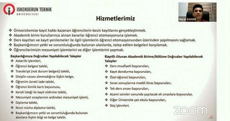 İskenderun Teknik Üniversitesi’nde (İSTE) 2023-2024 Eğitim Öğretim Yılı Oryantasyon Programı çevrimiçi olarak gerçekleştirildi. 10 Ekim Salı günü İSTE Youtube sayfasından canlı yayınla yapılan Oryantasyon Programında Öğrenci İşleri Daire Başkanlığı, Bilgi İşlem Daire Başkanlığı, Kütüphane ve Dokümantasyon Daire Başkanlığı ile Sağlık, Kültür ve Spor Daire Başkanlığı personelleri öğrencilere eğitim hayatları boyunca ihtiyaç duyacakları süreçlerle ilgili bilgi verdi.