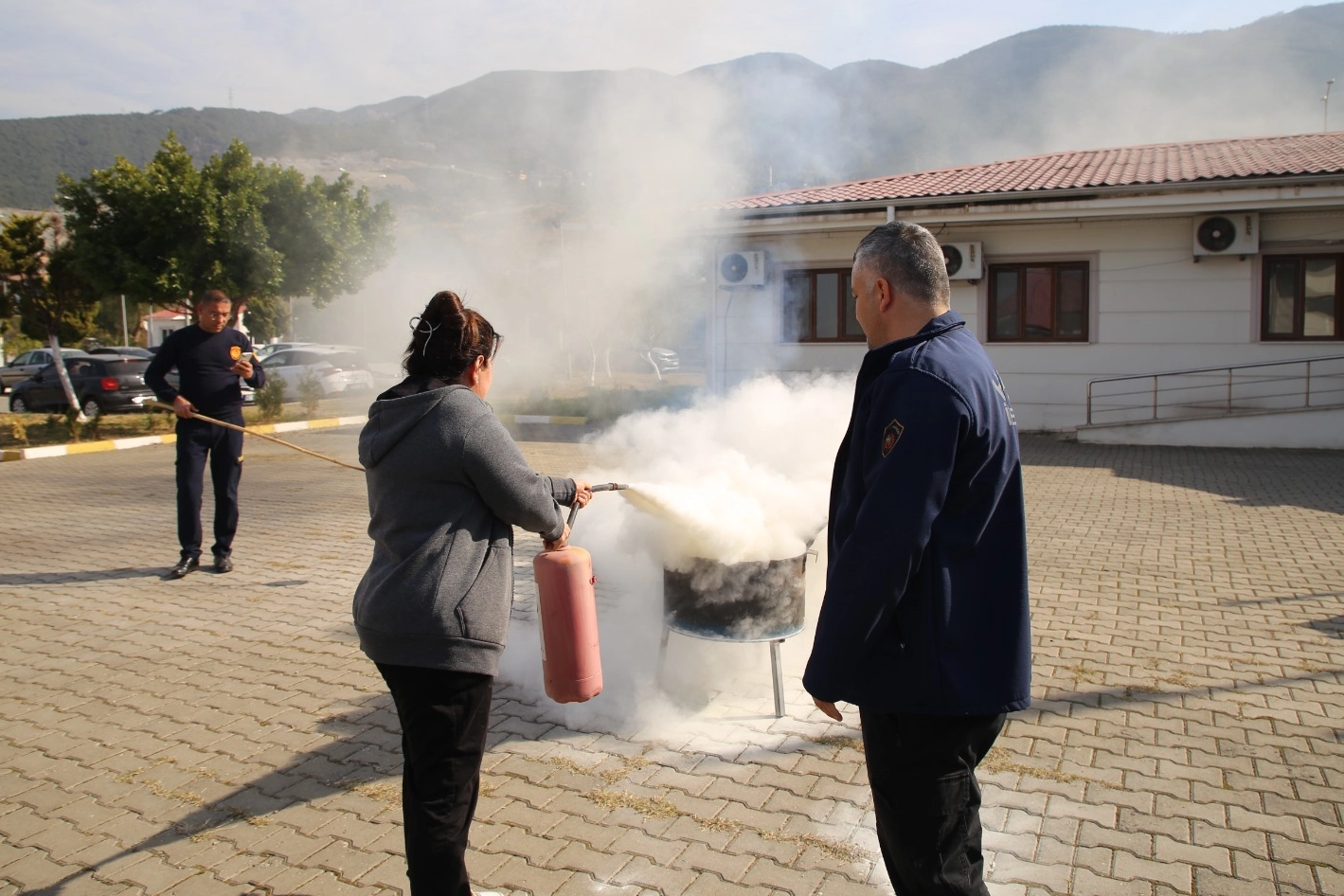 Personeller, yangın tüpü ile güvenli alanda yakılan yangına müdahalede bulunarak eğitimde aldığı bilgileri uygulama imkânı buldu.