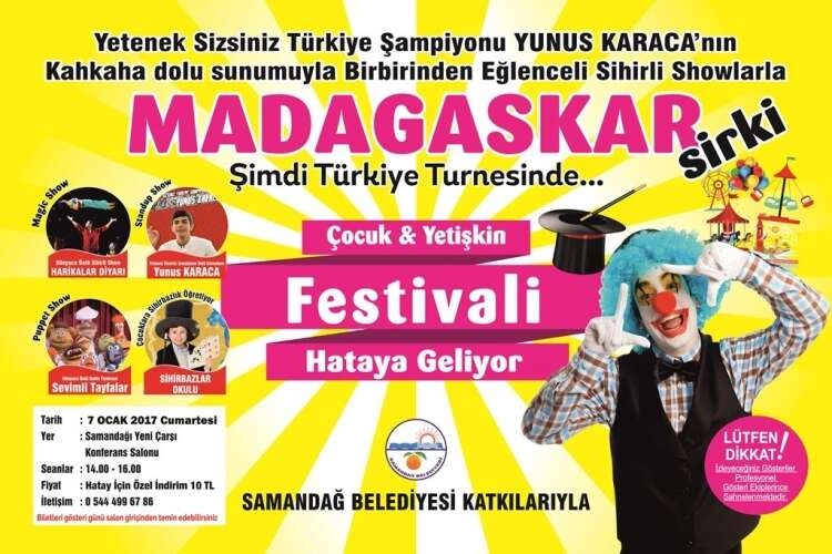 Magadaskar sirki, Komedi standup, magic show, dev kukla tiyatrosu, birbirinden iddialı eğlenceli sahne Showları, Extreme ve yarışmalar bu showda Samandağ’la buluşacak. Magadaskar sirki 7 Ocak 2017 Cumartesi günü iki seansta (14.00 ve 16.00) Samandağ Belediyesinin katkılarıyla sahnelenecek.
