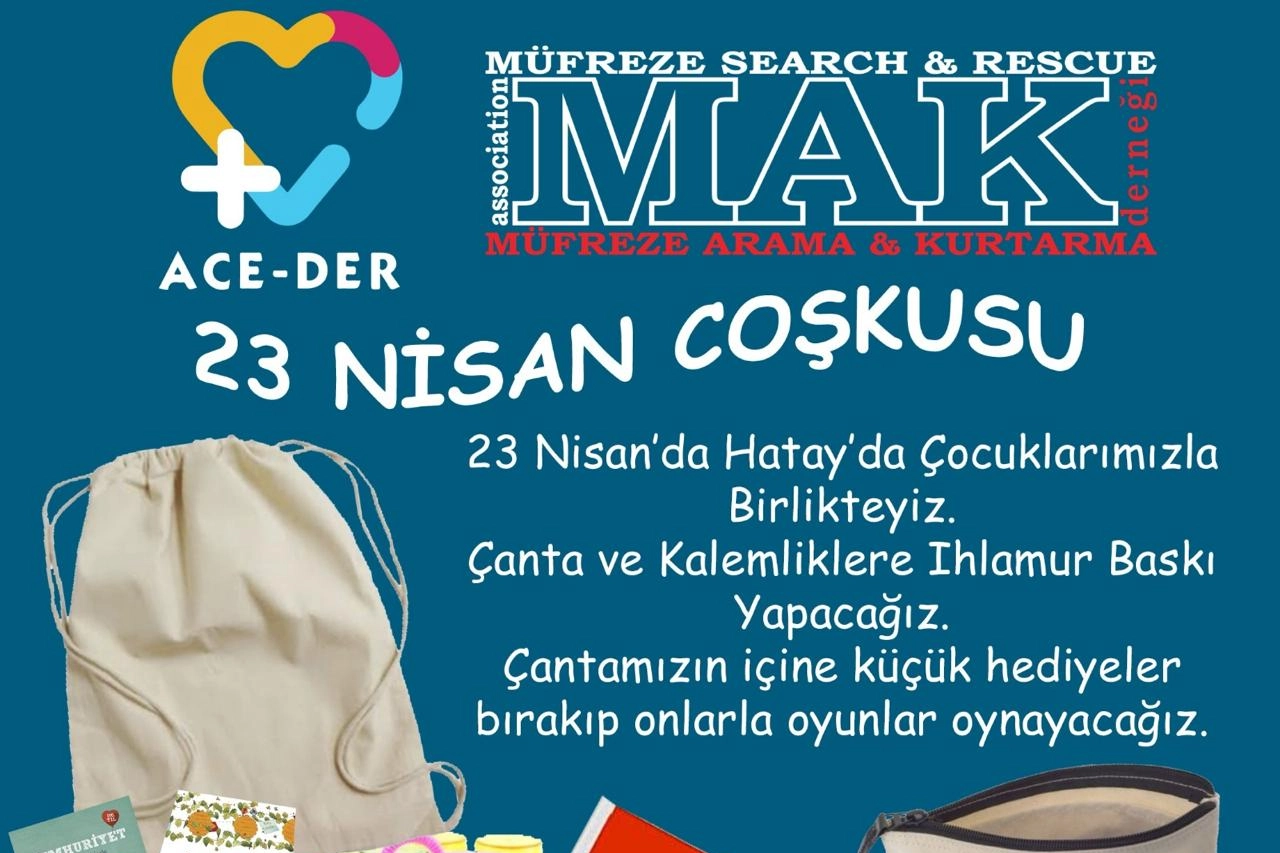 MAK ve ACE-DER yetkilileri tarafından yapılan açıklamada 6 Şubat 2023 depremlerinden sonra bölgeyi terk etmediklerini Arama Kurtarma faaliyetlerinden sonra İnsani Yardım faaliyetlerinin hızlıca başladığını ve devam ettiğini bildirdiler. 6 Şubattan bu yana bölgede su deposu, saha dağıtımı, aşevi, okul projesi faaliyetlerini tamamlayıp, hale hazırda yürüttükleri yardım projelerinin de devam ettiğini söylediler. Yardımlar kapsamında 23 Nisan Ulusal Egemenlik ve Çocuk Bayramı’nda Hatay’da depremzede çocuklarla beraber hem öğretici hem kültürel hem de eğlenceli vakit geçireceklerini söylediler. 23 Nisan Coşkusu Projesi kapsamında ilk etapta 2000 öğrenciye etkinlik yapma planları olduğunu söyleyen ekip, destekçilerin artmasıyla öğrenci sayısını 5000’e kadar çıkarabileceklerini ifade ettiler. Etkinlik Kapsamında çocuklara dağıtılacak hediye çantalara www.23nisancoskusu.com.tr adresinden destek olabilirsiniz. Etkinlik programı ise şu şekilde açıklandı; • Ihlamur Baskı Atölyesi • Resim Atölyesi • Sevgi Zinciri Atölyesi • Ritim - Dans Atölyesi • Hacivat – Karagöz Perdesi • Masal Çadırı • Futbol – Voleybol Turnuvaları • Çuval Yarışı • Parkur Oyunu • Toplu Oyun Alanları • Şişme Oyun Parkuru • Yüz Boyama