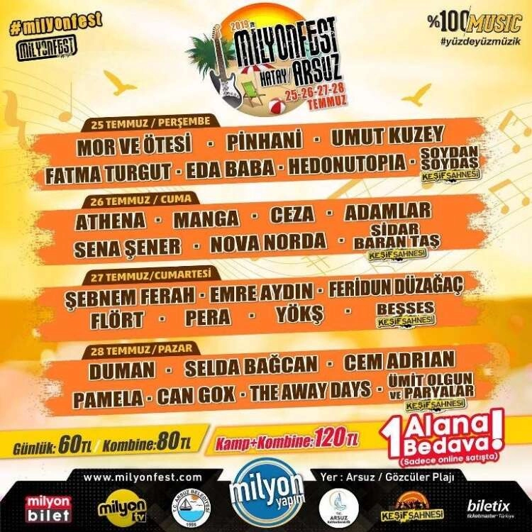 Türkiye'nin dört bir yanında gerçekleştirdiği birçok büyük festivalde yüzbinlerce genci rock ve alternatif müziğin yıldızlarıyla buluşturan Milyon Yapım yepyeni festivalini Hatay'ın doğa harikası ilçesi Arsuz' da düzenliyor.