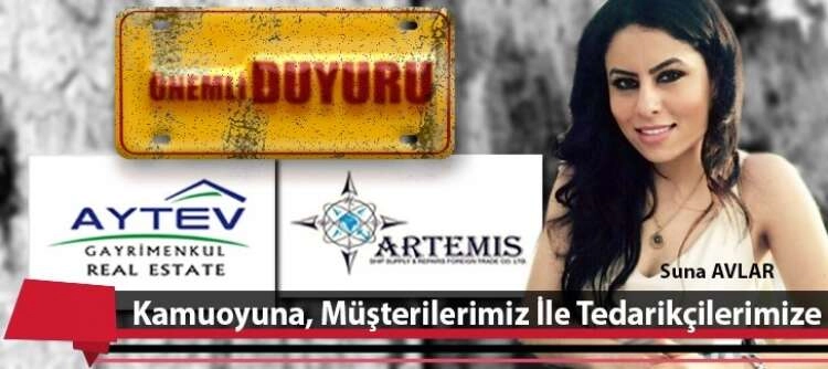 Geçtiğimiz günlerde yaşanan ve hepimizi derin üzüntüye boğan aile içi sorun neticesinde, hiçbirimizin arzu etmeyeceği bazı olumsuzluklarla karşı karşıya kaldık. Tüm bu tatsız ve üzücü hadiselere rağmen; Uzun yıllardır devam eden ticari faaliyetlerimizde herhangi bir aksama bulunmamakla birlikte, tüm alım-satım işlemleri ile mevcut tahsilat ve ödemeler düzenli olarak yapılmaktadır. Artemis Gemi Kumanyacılık ve Dış Tic. Ltd. Şti., Aytev Gayrimenkul Dan. ve İnş. San. Tic. Ltd. Şti ile Artemis Lojistik ve Liman Hizmetleri şirketlerinin Yönetim Kurulu Başkanı Sn. Mehmet Çetin, bir süre aramızda olamayacağından, söz konusu tüm şirketlerimizin ticari tüm faaliyetleri ve bu şirketler nezdindeki yönetim kurulu adına tüm yetkileri Suna AVLAR tarafından yürütülecektir. Bu zor günümüzde yanımızda olan ve bize destek olan tüm dostlarımız, kurum ve kuruluşlar, Şirketlerimiz Yönetim Kurulu Başkanı Sayın Mehmet Çetin adına teşekkürlerimizi sunarız. İş bu duyuru ile; Her üç şirketimizle uzun yıllardır karşılıklı güven, saygı ve sevgiye dayalı ticari ilişki içerisinde bulunan tüm şirketler, kurum ve kuruluşların, Artemis Gemi Kumanyacılık ve Dış Tic. Ltd. Şti., Aytev Gayrimenkul Dan. ve İnş. San. Tic. Ltd. Şti ile Artemis Lojistik ve Liman Hizmetleri şirketlerinin her türlü ilişkilerinde 0 326 613 54 92- 0326 613 53 91- 0 533 249 27 06 telefon numaralarından ve suna@artemismarine.com.tr - suna@artemismarine.com mail adreslerinden Suna Avlar ile görüşmeleri rica olunur. Saygılarımla Suna Avlar Artemis Gemi Kumanyacılık ve Dış Tic. Ltd. Şti., Aytev Gayrimenkul Dan. ve İnş. San. Tic. Ltd. Şti ile Artemis Lojistik ve Liman Hizmetleri Şirketleri Vekili