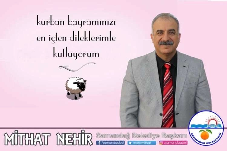 Samandağ Belediye Başkanı Mithat Nehir, bayramların kardeşlik, hoşgörü, huzur, barış iklimine katkı sunduğu yardımlaşma, sevgi, saygı duygularının en yoğun yaşandığı anlamlı günler olduğunu belirterek Tüm Halkımızın Kurban Bayramı’nı kutladı. Kurban Bayramının ülkemize, dünyaya, mazlum halklara barış, huzur, mutluluk, sağlık, esenlik getirmesini dileyen Başkan Nehir : ''Bayramlar; Toplumsal kaynaşma, dayanışma, birlik, beraberlik kardeşlik değerlerinin vücut bulduğu sevgi günleridir. İnsanların geleceğe umutla baktığı, güzelliklerin yeşerdiği, toplumsal kucaklaşmanın yaşandığı özel günlerdir. Bayramlar Yüzyıllar boyunca bu güzel coğrafyada birlikte kardeşçe yaşayan halkların kültürel zenginlikleri, ortak değerleri ve birleştirici gücüdür. Küskünleri barıştıran, çocukları mutlu eden, yaşlıların yüzünü güldüren bayram günlerinde bütün güzelliklerin hayatımıza yayıldığı bir ülke, bir dünya temennisiyle Tüm halkımızın Kurban bayramını en içten dileklerimle kutlar, saygılarımı sunarım.Dedi.