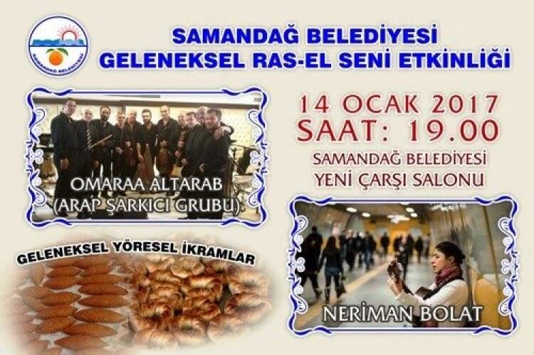 “Ras el seni il Arabi” Geleneksel Yılbaşı etkinliği bu yılda Yeni çarşı salonunda Samandağ Belediye Başkanı Mithat Nehir’in öncülüğünde gerçekleştirilecek. Arapça Müzik ve Yöresel ikramların sunulacağı bir konseptle 14 Ocak Cumartesi günü Saat 19.00’da halkın katılımıyla kutlanacak. Yüzlerce yıldır Samandağ Halkı Şemsi (Rumi )Takvime göre Yılbaşı ’ya denk gelen 14 Ocak’ta “Ras el seni “ Geleneksel dille “ras el seni il ğarbi” Arapça Yılbaşı’yı kutluyor. Samandağ Belediye Başkanı Mithat Nehir, Her yıl bu tarihlerde geleneksel olarak (14 Ocak sabahı )bireylerin aileleri, yakınları, komşuları ile sabah bayramlaştıklarını, birbirlerinin evlerine misafir olduklarını, göremedikleri yakınlarını görme fırsatı bulduklarını, bir bayram sevinci yaşandığını belirtti. Samandağ Belediyesi tarafından düzenlenen ras el seni etkinliğiyle halkıyla bir araya gelerek bayramlaşacaklarını ifade etti. ETKİNLİKTE SANATÇI NERİMAN BOLAT VE GRUP OMARA EL TARAB ARAPÇA MÜZİK İCRA EDECEKLER Etkinlikte Sanatçı Neriman Bolat ve Lübnanlı grup Omaraa Altarab’ın Arapça müzik parçalarını seslendirecekleri, Samandağ halkına geleneksel ikramlar(Yağlı simit,Oruk,Kebybet ,geleneksel tatlı) ikramlarının yapılacağı ifade edildi.