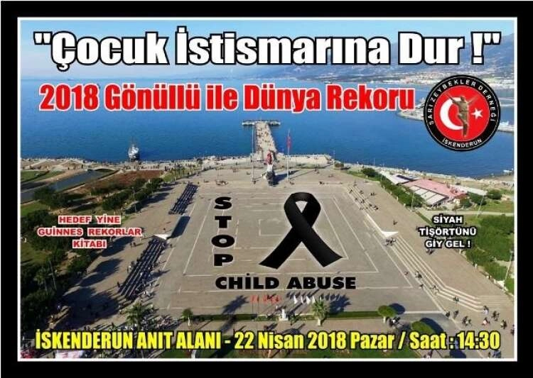 22 Nisan 2018 Pazar günü saat 14:30'da 2018 gönüllü ile İskenderun Anıt Alanı'na siyah renkli dev bir kurdela ve "STOP CHİL ABUSE" yani "Çocuklara Dokunma" yazısını kareografi olarak yazarak yeni bir dünya rekoru kırmayı amaçlıyor. Dünya rekoru ile ilgili bir açıklama yapan Sarı Zeybekler Dernek Başkanı Nevzat Kurt, " Çocuk istismarı ve ihmali, gerçek boyutları iyi bilinmeyen, çok ciddi toplumsal bir sorun olmanın yanısıra yol açtığı bedensel, zihinsel ve psikolojik bozukluklar ile bireylerde yaşam boyu iş gücü yitimi, uzun süreli ve yineleyici tetkik ve tedaviler nedeniyle topluma önemli ekonomik yük getirdiğinin" altını çizerek şunları söyledi : "Çocuk istismarı ve ihmaline ilişkin farkındalık ve önlenmesine yönelik çabalara verilen önem, toplumun uygarlık düzeyinin göstergesi olarak kabul edilmelidir. Mevcut sistemde istismara uğrayan-ihmal edilen çocukların tanı, tedavi, bildirim, izlem ve adli işlemlerinden oluşan süreç, çocuğu, yaşadıklarını uygunsuz koşullarda defalarca dile getirmeye zorlamakta ve uğradığı travmayı şiddetlendirmektedir. Bu nedenle sözkonusu istismara uğrayan çocuğun topluma sağlıklı bir şekilde yeniden kazandırılması için her vatandaşın üzerine düşen görevi layıkıyla yapması bir zorunluluktur. Biz de Sarı Zeybekler Derneği olarak 23 Nisan etkinlikleri kapsamında, 22 Nisan 2018 Pazar günü saat 14:30'da 2018 gönüllü ile İskenderun Anıt Alanı'na siyah renkli dev bir kurdela ve "STOP CHİL ABUSE" yani "Çocuklara Dokunma" yazısını kareografi olarak yazarak yeni bir dünya rekoru kırmayı ve yine Guinness Rekorlar Kitabı'na girmeyi amaçlıyoruz. Tamamen ücretsiz olacak dünya rekoru denemesine katılmak isteyen vatandaşların siyah tişört ile gelmeleri mecburidir. Bu konuya duyarlı olan herkesi özellikle çocukları ile birlikte rekor günü İskenderun Anıt Alanı'na bekliyor, hep birlikte İskenderun'dan bütün dünyaya "Çocuklara Dokunma" mesajını vermeye davet ediyoruz. Etkinliğimize ön kayıt yaptırmak isteyenler adını, soyadını ve telefon numaralarını 2018dunyarekoru@gmail.com adresine mail atmaları yeterli olacaktır."