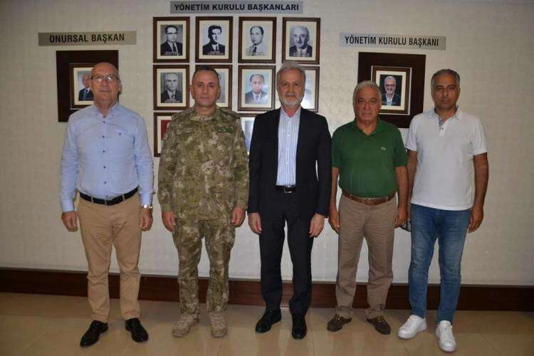 İskenderun 39.Mekanize Piyade Tugay Komutanı Tuğgeneral Alparslan Kılınç’ın veda ziyaretinde, İTSO Başkanı Levent Hakkı Yılmaz, İTSO Başkan Yardımcısı Muhsin Yeter, İTSO Yönetim Kurulu Üyeleri Müfit Tennioğlu ve Raşit Özyurt yer aldı.