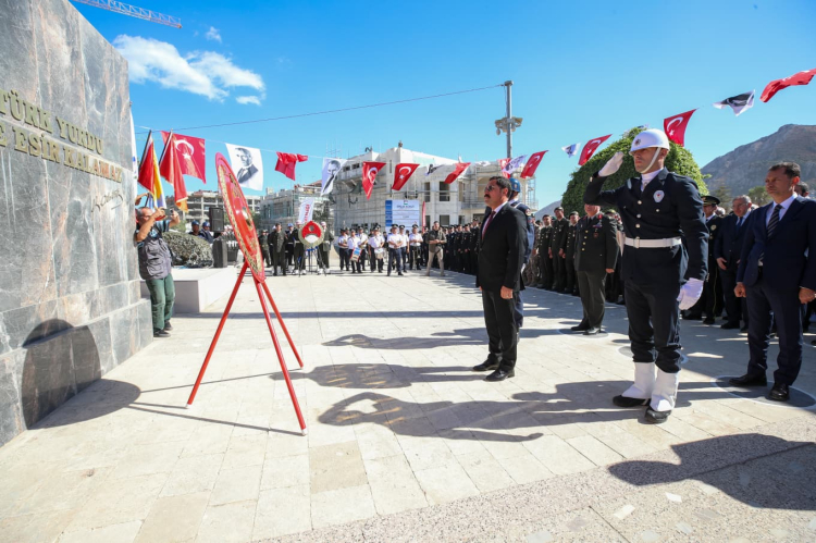 Atatürk Anıtı’na çelenk sunumuyla başlayan törene; Hatay Valisi Mustafa Masatlı, İl Garnizon Komutanı Tuğgeneral Ali Mete, Hatay Büyükşehir Belediyesi Başkan Vekili Kazım Armağan Teköz, il protokolü, kamu kurum ve kuruluşlarının temsilcileri ile kahraman gaziler katıldı.