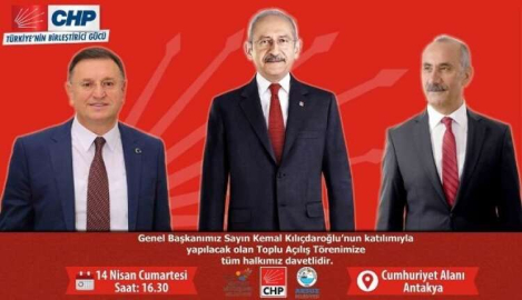 Başkan Culha mesajında, “14 Nisan 2018 cumartesi günü saat 16.30 da Genel Başkanımız Sayın Kemal Kılıçdaroğlu’nun katılımıyla, Antakya Cumhuriyet Alanında, Hatay Büyükşehir Belediyesi, Arsuz Belediyesi, Samandağ Belediyesi ve Defne Belediyesinin yapmış olduğu projelerin toplu açılış töreni yapılacaktır. Bütün halkımız ve basın mensubu arkadaşlarımız davetlidir. Katılımınız bizi onurlandıracaktır” ifadelerini kullandı.