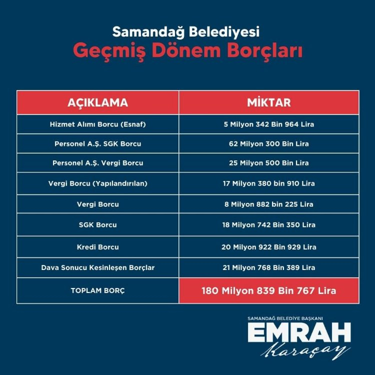 BAŞKAN EMRAH KARAÇAY, SAMANDAĞ BELEDİYESİ'NİN GEÇMİŞ DÖNEM BORÇLARINI AÇIKLADI