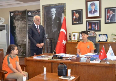 İskenderun Belediye Başkanı 23 Nisan Ulusal Egemenlik ve Çocuk Bayramı etkinlikleri kapsamında koltuğunu ortaokul öğrencisi Ömer Faruk Tiker’edevretti.