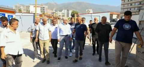 Belediye Başkanı Fatih Tosyalı, Eski Büyük Çarşı İşhanı yerinde Afad tarafından yapılan geçici işyerlerinde incelemelerde bulundu.