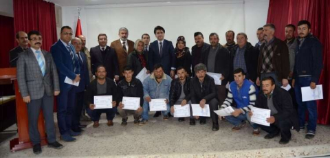 Kaymakamlık Konferans Salonunda düzenlenen törende kursiyerler sertifikalarını Kaymakam Abdulaziz AYDIN, Milli Eğitim Müdürü Bekir ŞAHAN, Halk Eğitim Müdürü Mehmet AKÇA, İlçe Gıda Tarım ve Hayvancılık Müdürü Veli KURT ve Ziraat Odası Başkanı Selahattin YALMAN’ın elinden aldılar.
