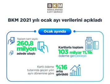 BKM verilerine göre, kredi kartları, banka kartları ve ön ödemeli kartlar ile ocak ayında yapılan toplam ödeme tutarı bir önceki yılın aynı dönemine göre yüzde 16 artarak 103 milyar TL oldu. Bu ödemelerin 86,2 milyar TL’si kredi kartları ile yapılırken, 15,6 milyar TL’sinde banka kartları, 1,2 milyar TL’sinde ise ön ödemeli kartlar kullanıldı. Büyüme oranları özelinde incelendiğinde kredi kartı ile ödemelerde önceki yılın aynı dönemine göre büyüme oranı yüzde 13, banka kartı ile ödemelerde yüzde 28, ön ödemeli kartlar ile yapılan ödemelerde ise bu oran yüzde 145 olarak gerçekleşti.