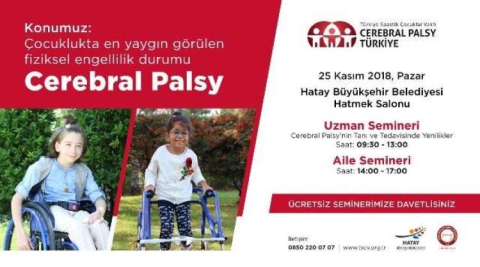 Türkiye Spastik Çocuklar Vakfı- Cerebral Palsy Türkiye, 25 Kasım Pazar günü saat 9.30- 17.00 saatleri arasında uzmanlara ve ailelere yönelik olmak üzere iki ayrı oturumda gerçekleştirilecek “Konumuz: Cerebral Palsy” adlı seminere Hatay halkının katılımını bekliyor.