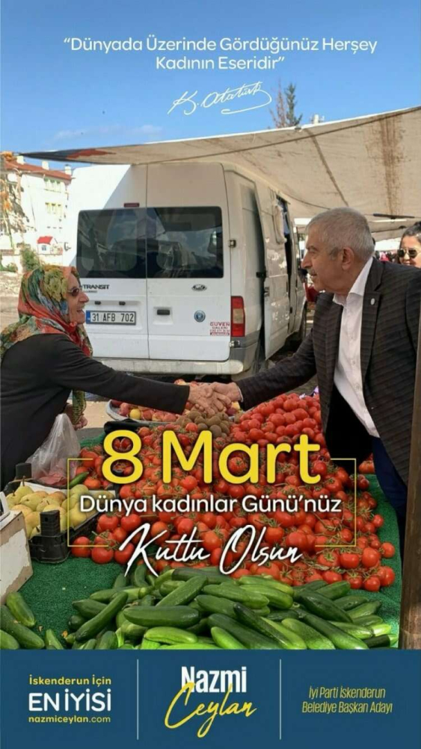 İYİ Parti İskenderun Belediye Başkan Adayı Nazmi Ceylan, 8 Mart Dünya Kadınlar Günü dolayısıyla kutlama mesajı yayınladı.