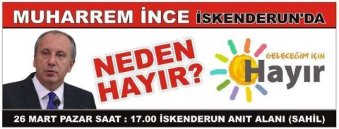 CHP Yalova Milletvekili Muharrem İnce Referandum çalışmaları kapsamında yurt genelinde başlattığı ‘Hayır’ mitinglerinden birini İskenderun’da gerçekleştirecek.