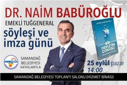 Emekli Tuğgeneral Naim Babüroğlu, yazdığı “Bir Devletin Çöküşü” adlı kitabının tanıtım ve imza günü için 25 Eylül Pazar günü saat 14.00’de Samandağ Belediyesi katkılarıyla gerçekleştirilecek. Emekli Tuğgeneral BABÜROĞLU, “Bir Devletin Çöküşü-Stratejik Derinlikten Bozguna” adlı kitabının imza günü için, 25 Eylül Pazar günü Samandağ Belediyesi hizmet binasında bulunan Toplantı salonunda olacak. Babüroğlu, kitabını imzalayacak ve okurlarıyla sohbet edecek.