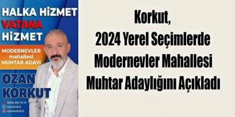 2024 Mart ayında yapılacak yerel seçimlerde Modernevler Mahallesi Muhtar adaylığını açıklayan Ozan Korkut, 'Muhtarlığın halka hizmet, vatana hizmet kapısı olduğunu göstermek için, vatandaşlarımızın yoğun talepleri üzerine mahallem için adayım' dedi.