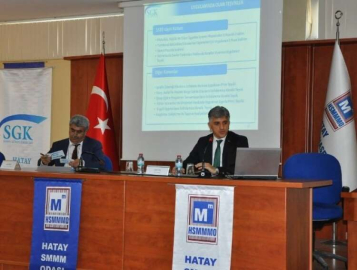 Hatay Serbest Muhasebeciler ve Mali Müşavirler Odası Toplantı Salonunda gerçekleştirilen bilgilendirme toplantısında Sosyal Güvenlik İl Müdürü Hamit Bal ve Çalışma ve İş Kurumu il Müdürü Ziya Yüksel tarafından bilgilendirme sunumu gerçekleştirdi.