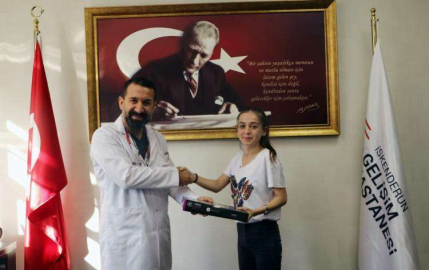 Hastanenin sevilen personeli Hüseyin Köse’nin kızı olan Helin Köse’yi makamında ağırlayarak tebrik eden İskenderun Gelişim Hastanesi Başhekimi Çocuk Sağlığı ve Hastalıkları Uzmanı Dr. Emin Turhan, Helin Köse’ye kurum adına steteskop hediye etti.