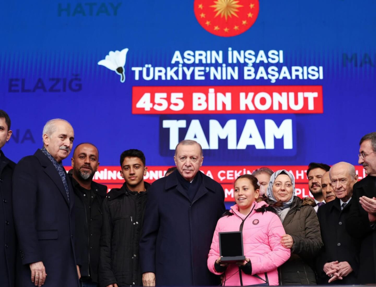 Bugün dünyada hemen hiçbir ülkenin altından kalkamayacağı büyük bir başarıya Hatay'da bizzat tanıklık ettiklerini söyleyen Cumhurbaşkanı Erdoğan, "Depremin vurduğu 11 ilimizde yapımı tamamlanan 455 bininci afet konutumuzu hak sahibi kardeşlerimize teslim etmenin gururunu yaşıyoruz." diye konuştu.